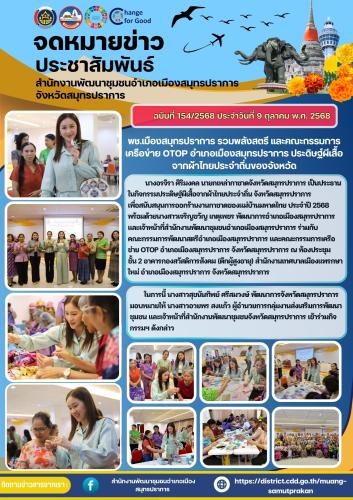 ในการนี้ นางสาวสุขนันทิพย์ ศรีสมวงษ์ พัฒนาการจังหวัดสมุทรปราการ มอบหมายให้ นางสาวอวยพร สงแก้ว ผู้อำนวยการกลุ่มงานส่งเสริมการพัฒนาชุมชน และเจ้าหน้าที่สำนักงานพัฒนาชุมชนจังหวัดสมุทรปราการ เข้าร่วมกิจกรรมฯ ดังกล่าว